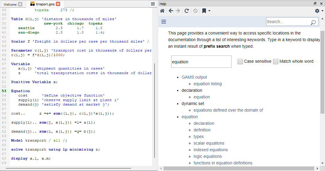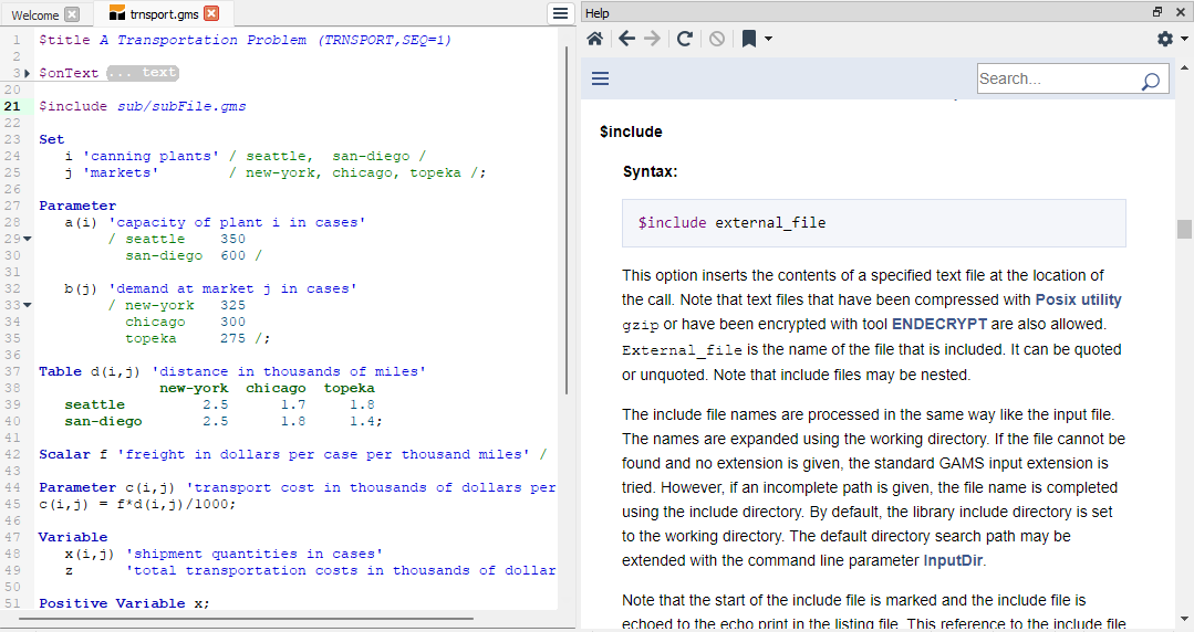 The Code Editor provides common functionality for editing, with GAMS-specific syntax highlighting. On the left side, there is a special area displaying line numbers and icons for links and errors generated by the compiler.