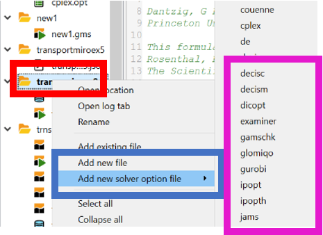 - Right-clicking on a group file name (red) in the Studio Explorer then selecting add new solver option file (blue) and subsequently selecting one of the many available solver names (magenta and only a few shown). This will create a file you then need to save.