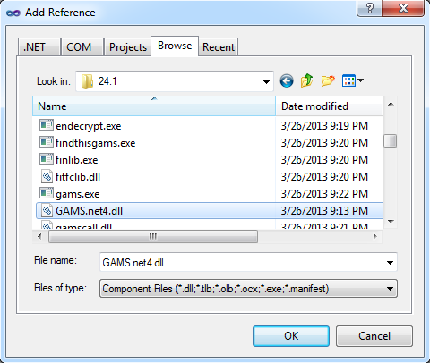 Once you opened the project add a reference by a right click on References inside the solution explorer. Then choose Add Reference.. and select the Browse tab. Next navigate to the location where you installed GAMS.net4.dll, typically the GAMS system directory, e.g. C:\GAMS\53. Then choose GAMS.net4.dll and click OK.