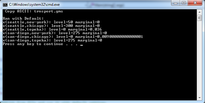 Here we load the model trnsport from the GAMS Model Library. In doing so it is made available in the current working directory and can be loaded by the GAMSWorkspace.AddJobFromFile Method afterwards. Apparently this method also works with any other gms file you might have created on your own as long as it is located in the current working directory. Then the GAMSJob t1 is defined from that file and run by the GAMSJob.Run method.