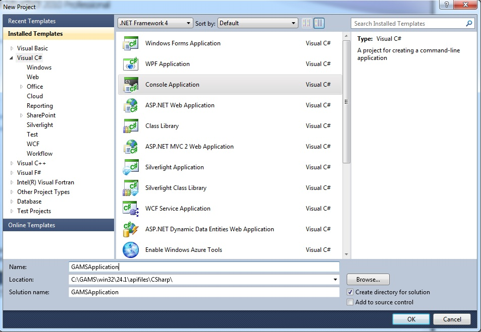 After opening Microsoft Visual Studio you can open the New Project wizard by choosing File > New > Project from the ribbon menu and type a name for your application, e.g. GAMSApplication.