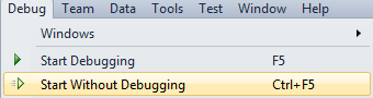 Then click the highlighted button from figure (a) down below or press F5 to start debugging. You can also start the program without debugging by pressing Control + F5 or choosing Debug > Start Without Debugging from the ribbon menu as illustrated in figure (b).