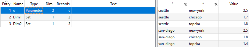 The first example of this collection demonstrates the key commands of CSV2GDX. For instance, consider the table statement of the model [trnsport] from the GAMS Model Library: