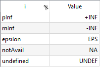Note the $onUndf command in order to enter Undf values directly within the definition of the scalars. When we view the generated GDX file in GAMS Studio, the special values are shown (note that the figure shows a parameter actually instead of five single scalars for a more compact presentation):