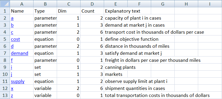 The table of contents can be reached again by clicking on the TOC link in the top left corner. The complete process shown here can be automated as is shown in section Model gdx2xls1: import trnsport.gdx. As can be seen, every identifier is stored in its own sheet. Index positions get a column with labels showing their domains, or dim1, dim2, etc. if domain information is not available. By default scalar quantities are collected in a single sheet called scalar.