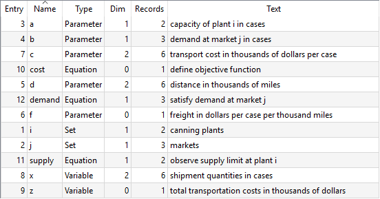 SyNr Type DomInf Symbol 3 Par Regular a(i) 4 Par Regular b(j) 7 Par Regular c(i, j) 10 Equ None cost 5 Par Regular d(i, j) 12 Equ Regular demand(j) 6 Par None f 1 Set None i(*) 2 Set None j(*) 11 Equ Regular supply(i) 8 Var Regular x(i, j) 9 Var None z