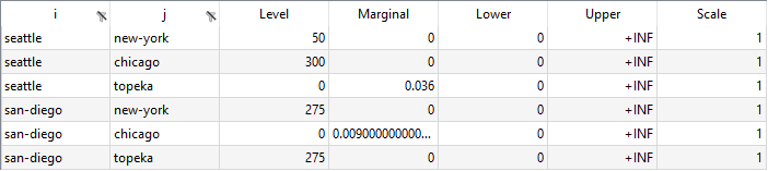 canning plants;markets;shipment quantities in cases;Level;Marginal;Lower;Upper;Scale "seattle";"new-york";50;0;0;1E+100;1 "seattle";"chicago";300;0;0;1E+100;1 "seattle";"topeka";0;0,036;0;1E+100;1 "san-diego";"new-york";275;0;0;1E+100;1 "san-diego";"chicago";0;0,00900000000000001;0;1E+100;1 "san-diego";"topeka";275;0;0;1E+100;1