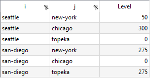 "i","j","Val" "seattle","new-york",50 "seattle","chicago",300 "seattle","topeka",0 "san-diego","new-york",275 "san-diego","chicago",0 "san-diego","topeka",275
