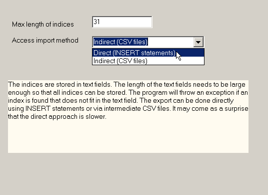 A feature added in version 2.9 is the possibility to use intermediate CSV (comma separated value) files instead of using direct SQL INSERT statements. The CSV files can be read into Access using a bulk operation and is therefore faster for large datasets. When using CSV files make sure double quotes are used (if single quotes are used they will become part of the data). The temporary CSV files will be written to the Windows TEMP directory (e.g. C:\WINDOWS\TEMP). When the import is done, these scratch files will be removed automatically. If you want to look at the CSV files that are being fed into Access, export the data to a CSV file.