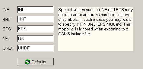 When we export to a GAMS include file all special values are understood, so the mapping is not used. The defaults button will reset the mapping to their default values.