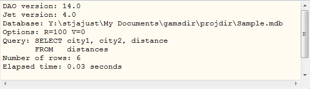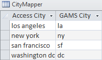 Q="SELECT [GAMS City], value FROM [example table], CityMapper WHERE [Access City]=city"This option is demonstrated in Example 1 - Reading a single valued Table for instance
