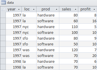 Q=SELECT prod, loc, year, 'sales', sales FROM data \