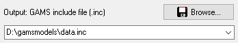 This option specifies the name of the output file. The format of the output file will be a GAMS include file for a parameter or set statement. Make sure the directory is writable. UNC names can be used. An output file must be specified for batch operation: i.e. either