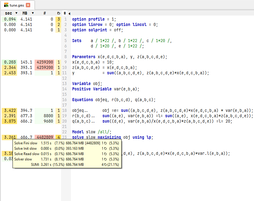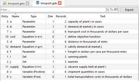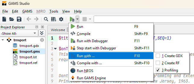 This is important to note: if you have a.gms and b.gms in a single project, and a.gms is set as the main file, pressing F9 while viewing b.gms will still run a.gms. To execute b.gms instead, you must first set it as the main file.