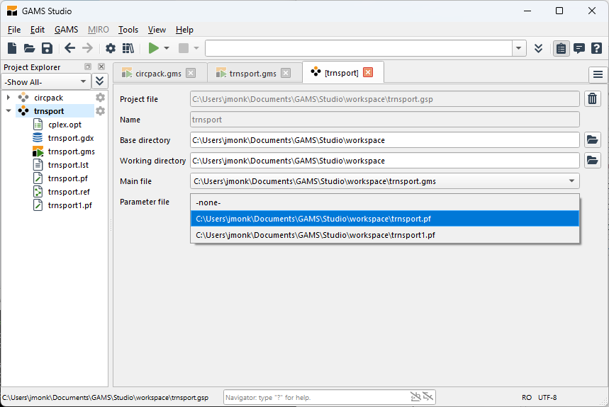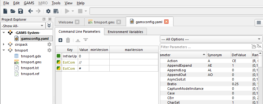 Another crucial difference is the concept of a "main file." While the GAMSIDE always executed the .gms file that was currently active in the editor, GAMS Studio executes the main file of the currently active project.