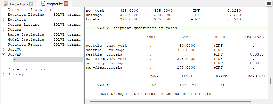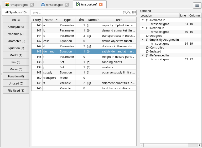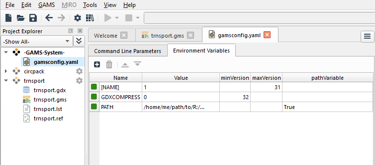 In the GAMSIDE, you always started by creating a "Project," which was essentially a pointer to the file system that defined a single working directory (i.e., it implicitly defined the workDir when starting GAMS). This directory was used to execute all the models added to the project, regardless of where the model files themselves were located. For example, if your project was in directory a, and you added models a/a.gms and b/b.gms, both files would be executed with a as the working directory. This meant all input data was expected in a (or relative to it), and all output files were also generated in a, not necessarily in the file's original location (like b).