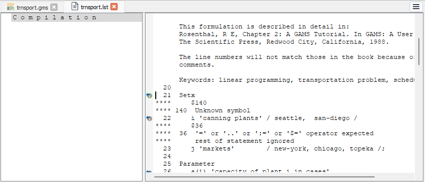 The Code Editor provides common functionality for editing, with GAMS-specific syntax highlighting. On the left side, there is a special area displaying line numbers and icons for links and errors generated by the compiler.