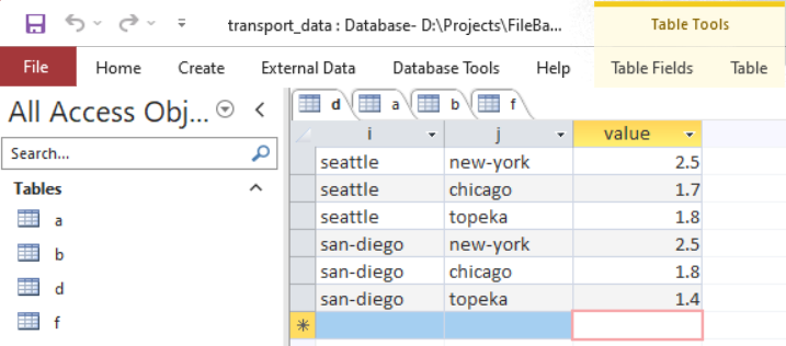 The MS-Access database file transport_data.accdb contains four tables with data for the parameters d, a, b and f: