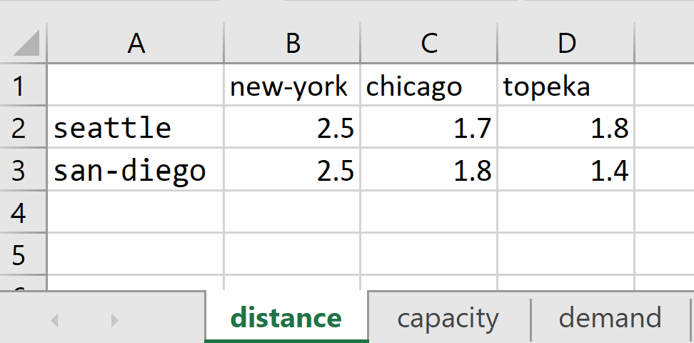 The example uses compile-time embedded Connect code to read the data with the ExcelReader agent. The ExcelReader agent creates the parameters in the Connect database. All parameters can be directly written to the GAMS database using the GAMSWriter agent. The GAMSWriter makes the parameters available outside of the embedded Connect code. Note that the sets i and j are implicitly defined through the parameter d. Embedded Connect code is also available at execution time, see the example in the following section Export to Excel.
