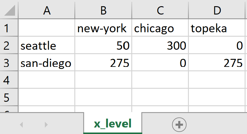The example uses execution-time embedded Connect code to export the results to an Excel file. The GAMSReader agents imports variable x from the GAMS database into the Connect database. The Projection agent is used to create a new parameter that contains only the level values of variable x. The final parameter x_level is then written to output.xlsx using the ExcelWriter agent. Since no range is specified the parameter will be written to range x_level!A1. The content of the file output.xlsx looks as follows: