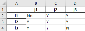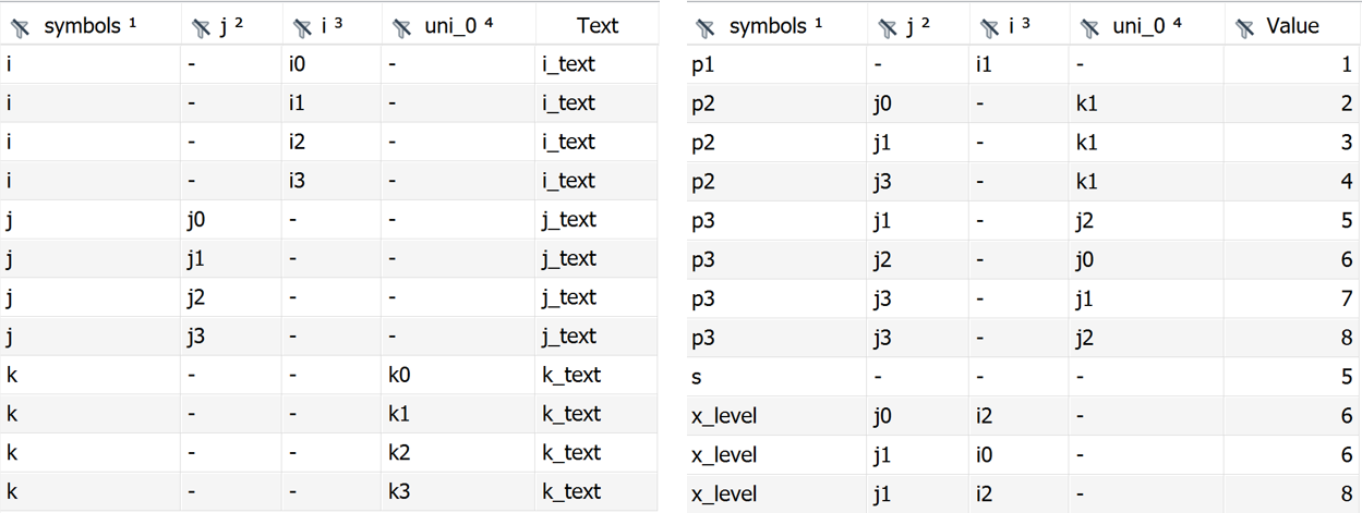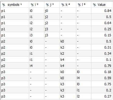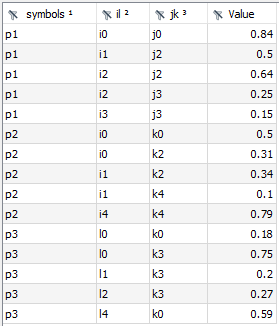 The CSVWriter automatically sorts the symbol records according to the categories (note that the order of column j was changed with the PythonCode agent) and therefore, the content of file ijk_out.csv looks as follows: