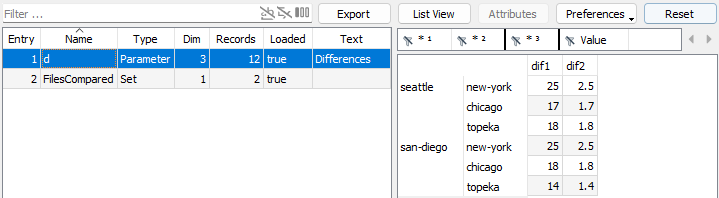and summarizes the differences found. Simultaneously the file diffile.gdx when examined in GAMS Studio contains the following: