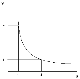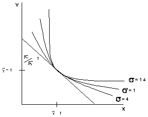 A utility function is represented in MPSGE by the specification of: (i) benchmark demand quantities, (ii) benchmark demand prices (iii) an elasticity of substitution at the benchmark point. Benchmark quantities determine an anchor point for the set of indifference curves. Benchmark prices fix the slope of the indifference curve at that point, and the elasticity describes the curvature of the indifference curve. Speaking formally, elasticities provide a "second order approximation" of the utility function. To understand the importance of the benchmark elasticity of substitution, consider Figure 6. This figure shows three indifference curves all of which share the same benchmark quantities and benchmark prices. They differ only in the elasticities of substitution. The least convex (flattest) curve has the highest elasticity, the most convex curve has the lowest elasticity. (When the elasticity of substitution is 0, the indifference curve is L-shaped with the corner at the benchmark point.)
