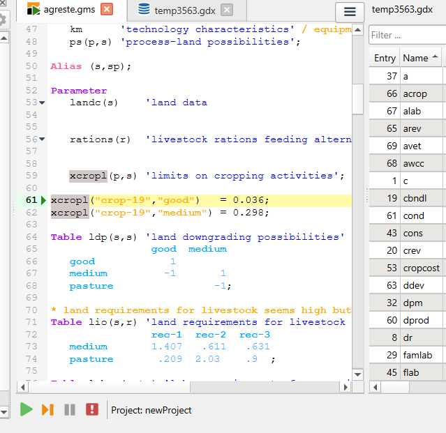 A quite new feature of STUDIO is the debugger. With the debugger one can specify a line to run to in the code then run up to that point and suspend execution and get a program generated GDX file of all the data items as of the start of that statement. One can then examine all the data and either