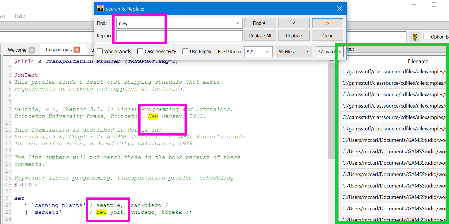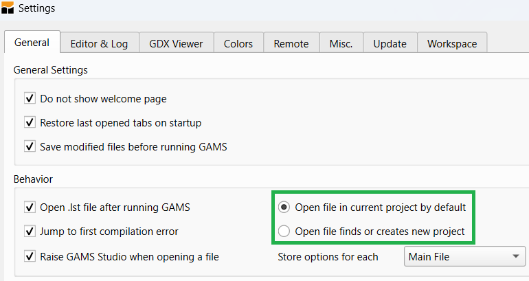 What is a project? GAMS STUDIO employs a "Project" file for two purposes. First, the project location determines where all saved files are placed (to place files elsewhere use the save as dialogue) and where GAMS looks for files when executing. Second the project saves file names and program options associated with the effort. I recommend that you define a new project every time you wish to change the file storage directory.