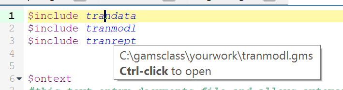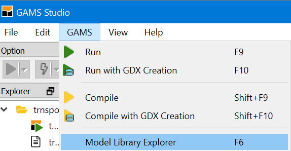 Open the GAMS model library explorer under the GAMS tab or press F6 (this is the simplest for first time users and the one we will use)