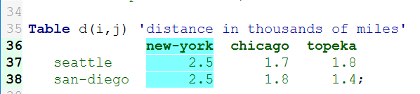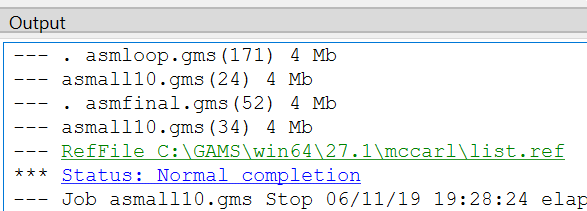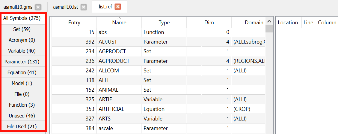 | Declared | places where the named item is declared in a Set, Parameter, Table, Scalar, Variable, Equation, Acronym, File or Model command. This will be the first appearance. |
