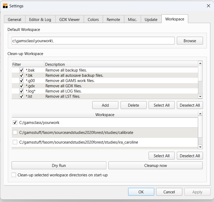 There you identify types of files to delete and directories to clean (be careful with your selections as you may want to retain LST, LXI, REF and GDX files plus may only want to clean selected places). Once these selections are made then pressing the Cleanup now button removes thse files from the project directory and the Explorer.