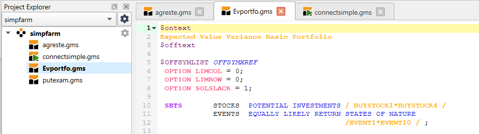 Therein the active tabs involve multiple files from each project with no real identification of what is from where. In addition the file agreste.gms is active and is present in both projects. In this case both projects use that file from a common location but this could be pointing to two identically named files in two different places. This potential overlap and file convolution can be confusing.