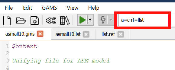 Note, the file location determines where all generated files are placed (to place files elsewhere use the save as dialogue) and where GAMS looks for files when executing. I recommend that you make sure your file is in a place where you want it also making sure that place contains all associated files i.e. this is the file storage directory for this endeavor.