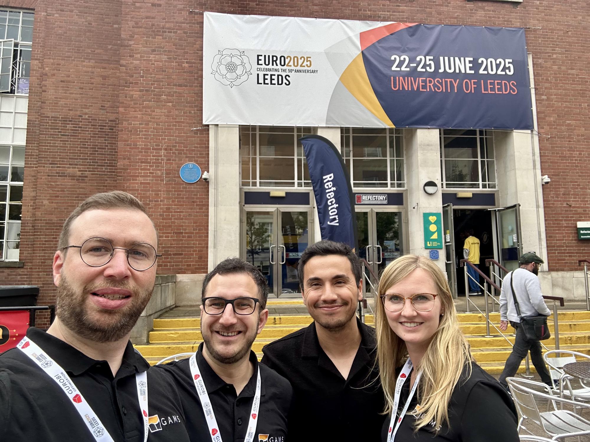 The EURO 2025 conference brought us to Leeds this year, where the GAMS team once again had the opportunity to connect with the European Operations Research community. From Sunday to Wednesday, our team — Justine Broihan, Andre Schnabel, Muhammet Soytürk, and Frederik Proske — represented GAMS at our booth and through a series of presentations. As additional supporters to our team, our colleagues Stefan Vigerske and Stephen Mayer also went to Leeds to have two talks during the conference, contributing valuable insights from their areas.