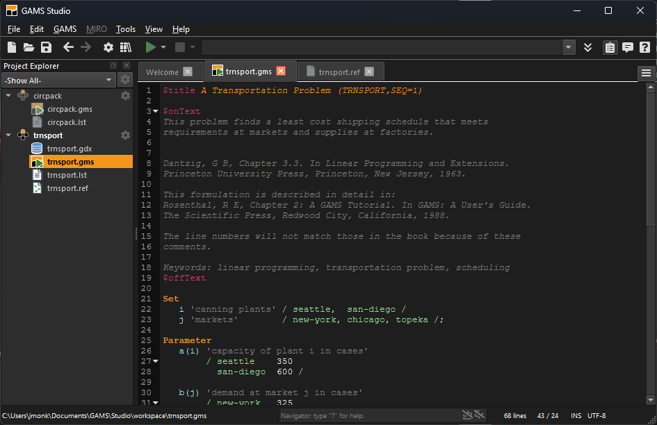 In the GAMSIDE, you always started by creating a "Project," which was essentially a pointer to the file system that defined a single working directory (i.e., it implicitly defined the workDir when starting GAMS). This directory was used to execute all the models added to the project, regardless of where the model files themselves were located. For example, if your project was in directory a, and you added models a/a.gms and b/b.gms, both files would be executed with a as the working directory. This meant all input data was expected in a (or relative to it), and all output files were also generated in a, not necessarily in the file's original location (like b).