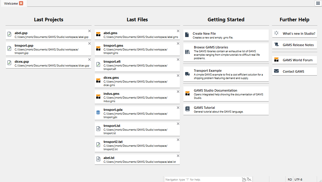 The Welcome page is the starting point of GAMS Studio. It is designed to provide quick access to common actions and offer helpful information. The page is divided into four columns.