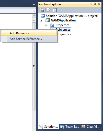 Once you opened the project add a reference by a right click on References inside the solution explorer. Then choose Add Reference.. and select the Browse tab. Next navigate to the location where you installed GAMS.net4.dll, typically the GAMS system directory, e.g. C:\GAMS\53. Then choose GAMS.net4.dll and click OK.