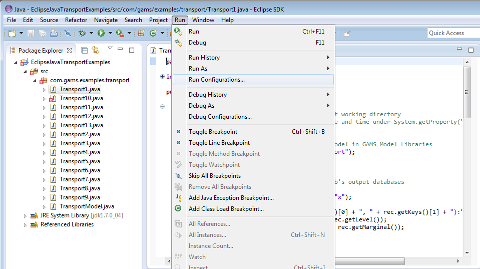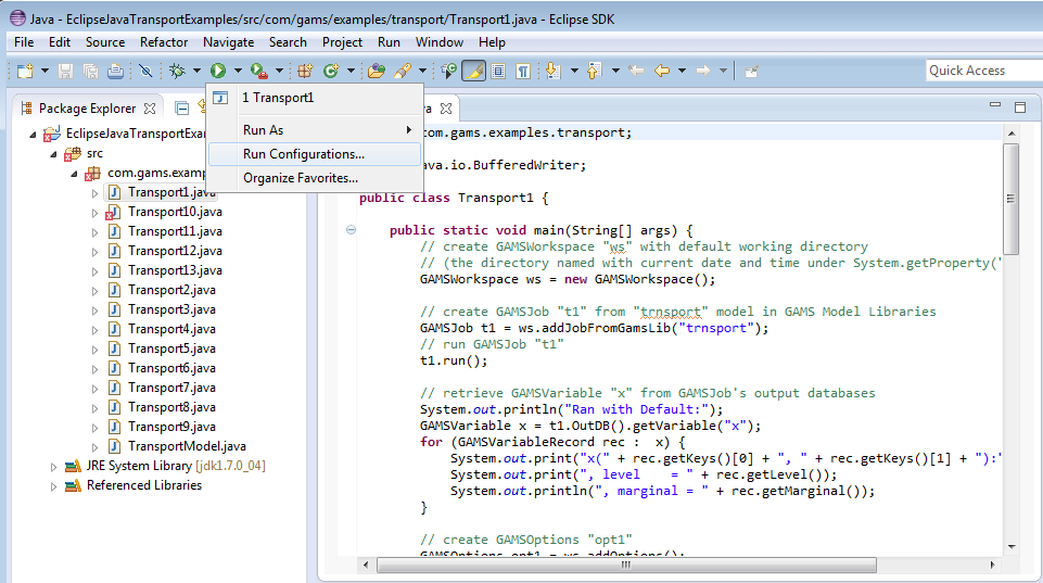 At first we have to add an additional jar file to the [CLASSESPATH] since we use the Java Excel API which can be downloaded from UCanAccess. We unzipped the downloaded into C:\tools. To compile and run eg. on a Windows platform from the command line go to C:\GAMS\[gams-version]\apifiles\Java\transport and use: