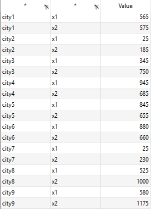 This example demonstrates how to read the options from an external text file as already mentioned in section Filename. The file distance.csv from the Getting Started Example 1 will be processed with CSV2GDX while reading the options from an external text file named howToRead.txt.