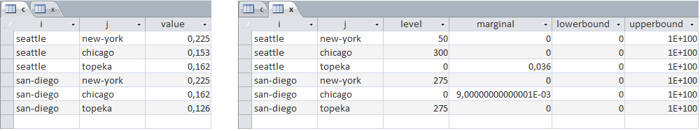 As can be seen, every identifier is stored in its own table. For parameters like c, the value is stored in a column named value, while variables like x and equations have the columns level, marginal, lowerbound and upperbound. A possible additional field (scale for NLP's, priority for MIP’s, stage for stochastic problems) is not exported. If needed, you can assign such a quantity to a parameter in GAMS before writing the GDX file. The complete process shown here can be automated as demonstrated in Example 1.