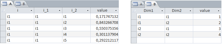 If no domain information is available for a symbol (like B in the code below), each index position gets a column and will be labeled automatically with dim1, dim2, etc. If domain information is available, the columns will use that information but keeping the names unique (like A in the code below). The small example below shows how the index positions are made unique using the (relaxed) domain information by adding an ascending number to the identifier.