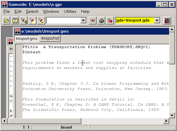 C:\> gams trnsport.gms GDX=trnsport.gdx