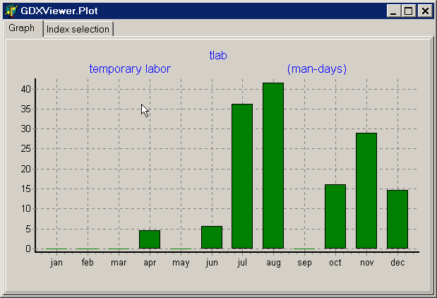 GDXVIEWER has a built-in facility to quickly plot data. It includes LINE, BAR and PIE charts, examples are shown below. The plots can be made through the menu File|Plot.