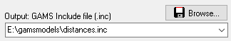 This option specifies the name of the output file. The format of the output file will be a GAMS include file for a parameter or set statement. Make sure the directory is writable. UNC Names can be used. An output file must be specified for batch operation: i.e. either
