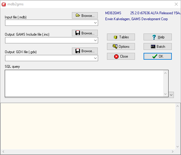 When running the executable mdb2gms.exe without command-line arguments, the tool will run interactively with a built-in GUI interface. Alternatively MDB2GMS can be run in batch mode, which is useful when running it directly from a GAMS model without user intervention using the $call command at compile time or the execute command at execution time.