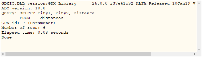 C=connectionString. - The name of outputFile, either an include file (.inc) or GDX file (.gdx), must be specified. Using an include file to store the results of the query is indicated by the option
