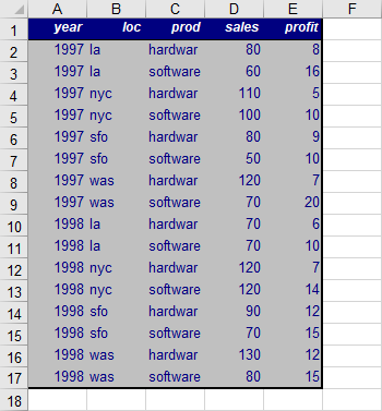 Q=SELECT prod, loc, year, 'sales', sales FROM data \ UNION \ SELECT prod, loc, year, 'profit', profit FROM data