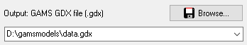 This option specifies the name of the output file. The format of the output file will be a GAMS GDX file. Make sure the directory is writable. UNC names can be used. If the GDX file already exists it will be overwritten - it is not possible to append to a GDX file. An output file must be specified for batch operation: i.e. either