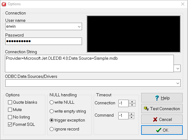 | Q | Query | none | This option can be used to specify a SQL query (required). |